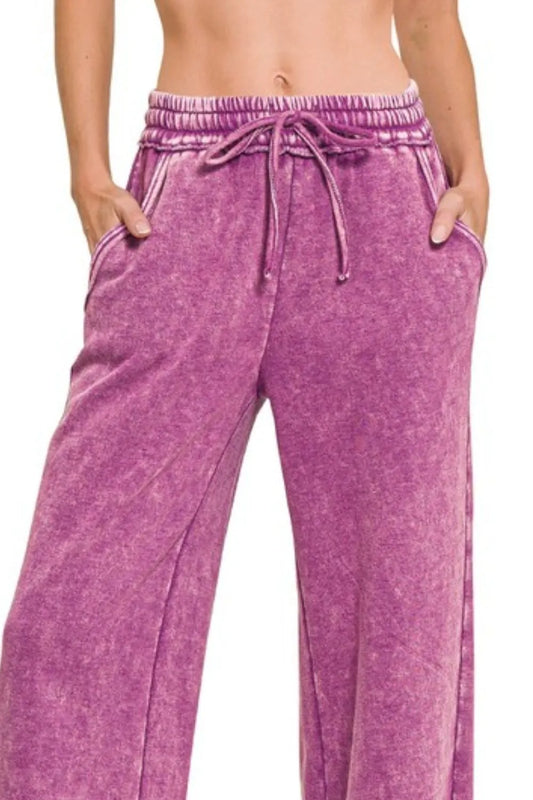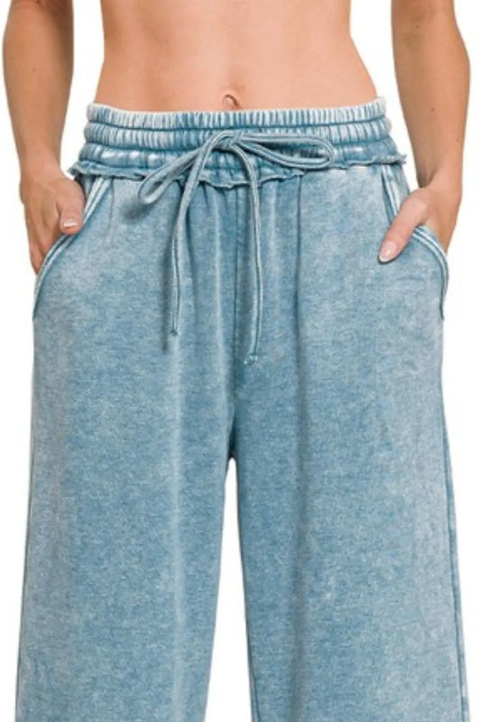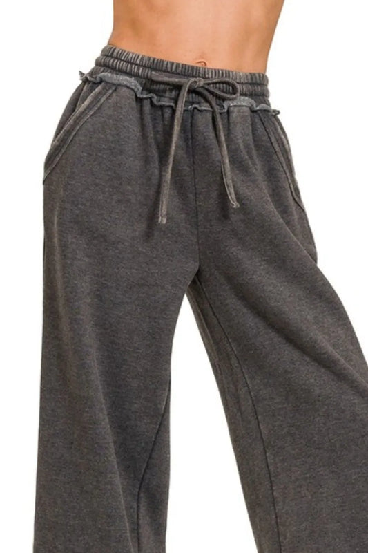Zenana Acid Wash Fleece Palazzo Sweatpants with Pockets