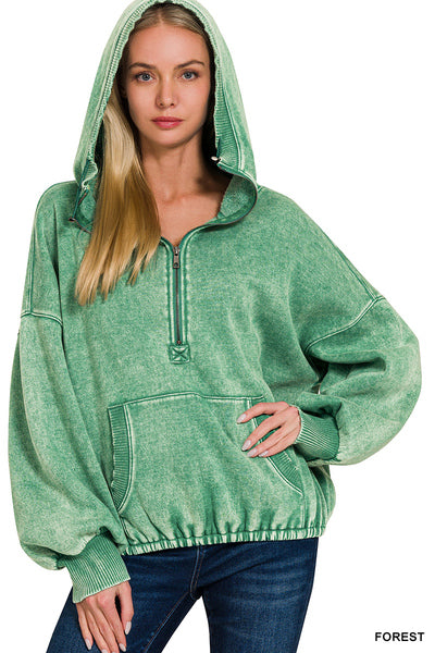 WASHED DRAWSTRING HEM HALF ZIP KANGAROO HOODIE