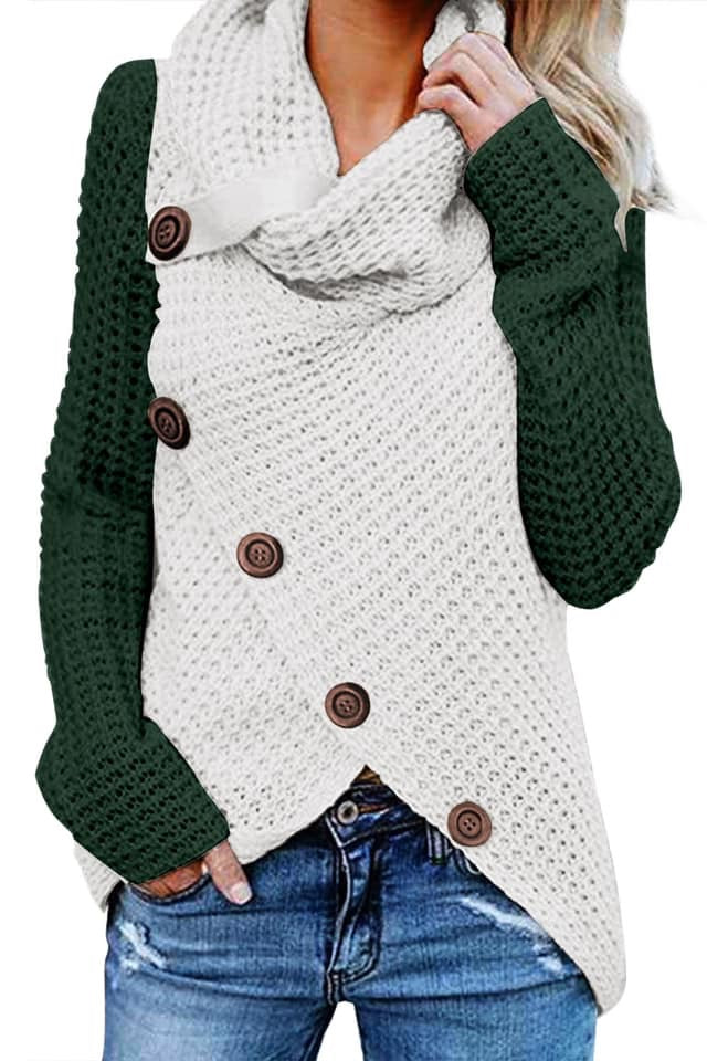 • Turtle cowl neck with button details, crossover wrap asymmetric hem