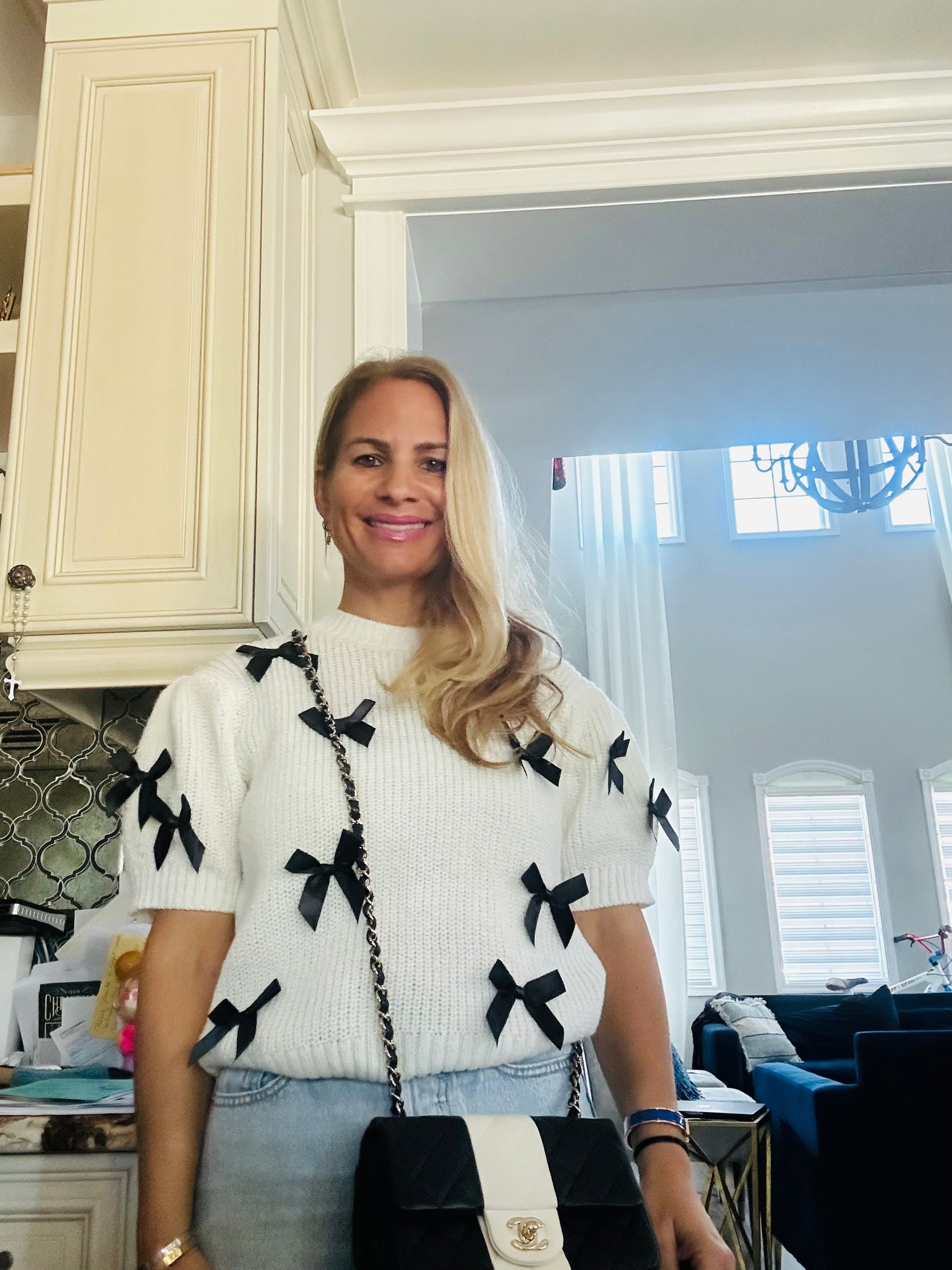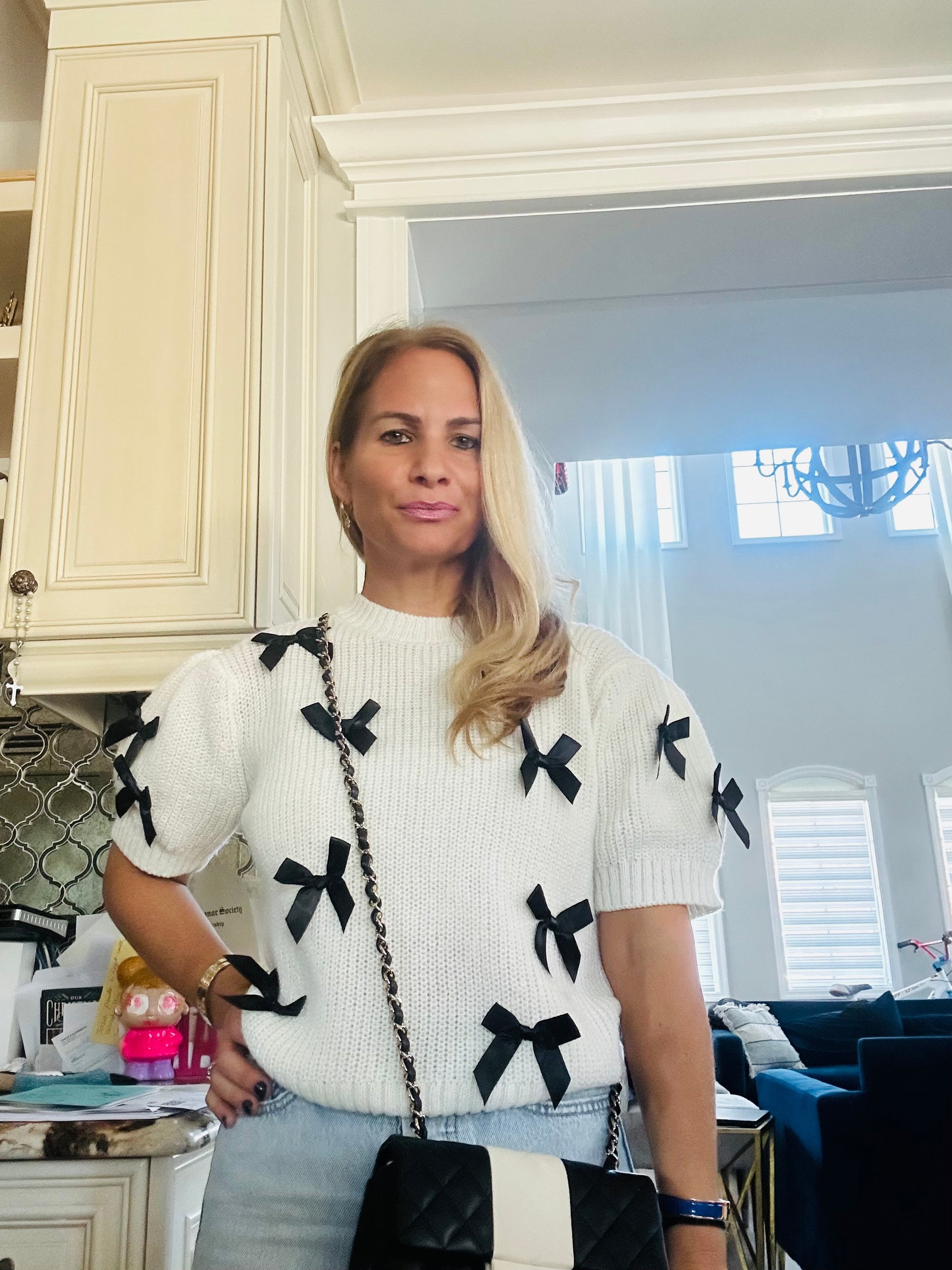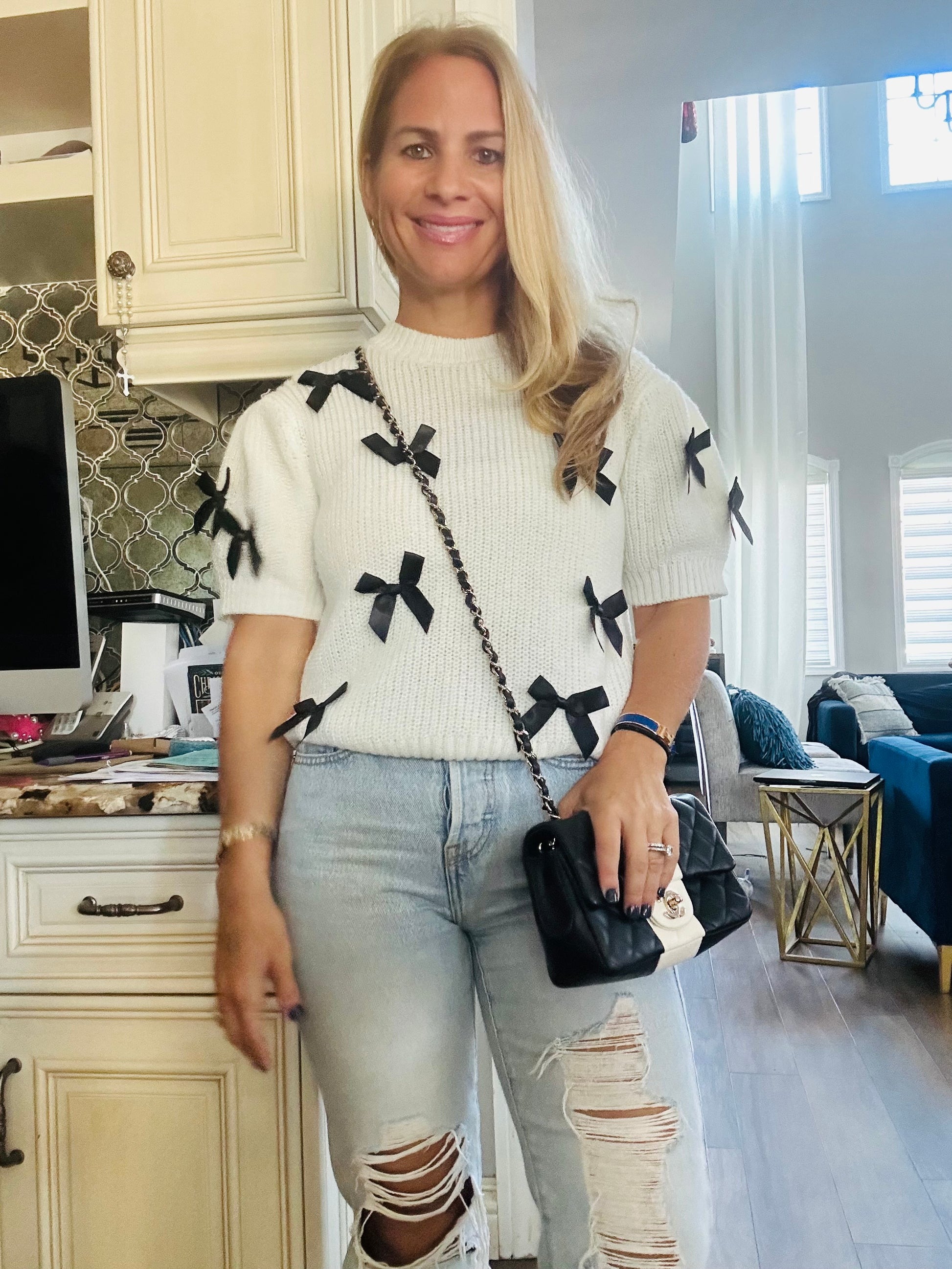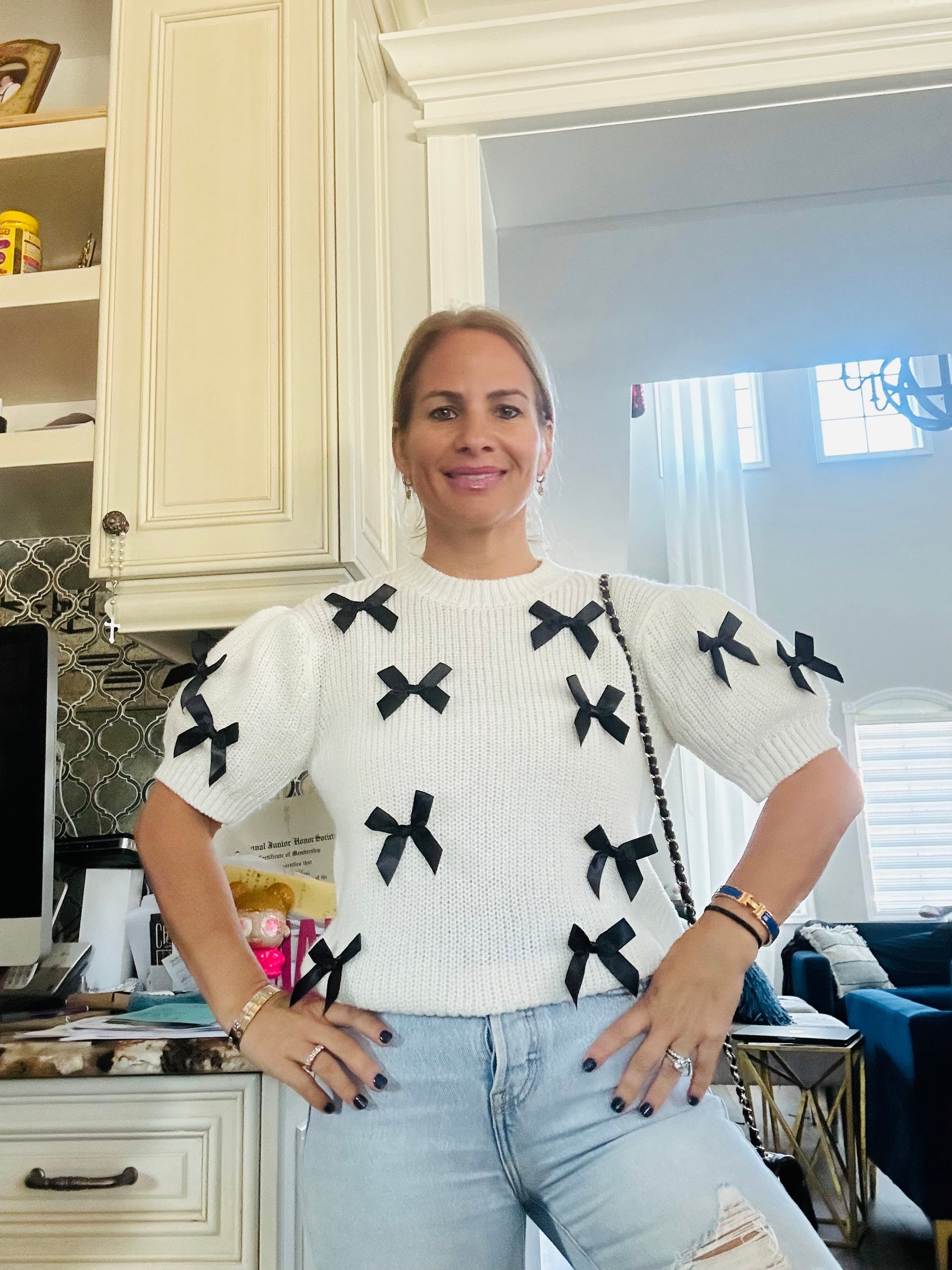 Short Sleeve Ivory Bow Sweater. Lite weight