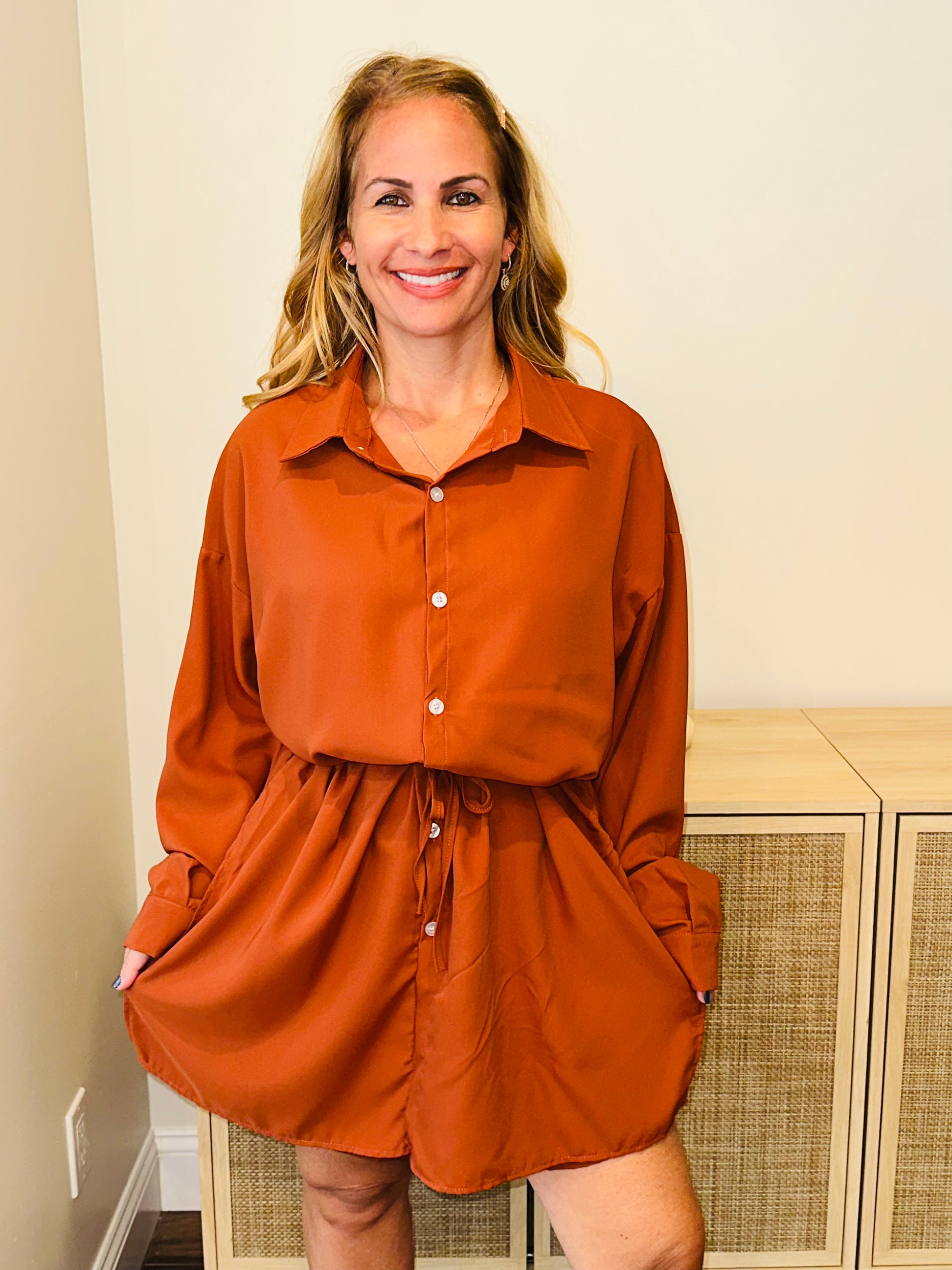 Rust  shirt dress with shorts underneath would look fabulous with a heel or a High boot.